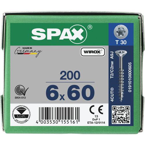 SPAX univerzális csavarok teljes menettel - süllyesztett fejjel, önmetsző hegyű. A kiváló minőségű, teljes menetű SPAX univerzális csavarok gyors, hatékony és tiszta munkához készültek fában, előfúrás nélkül. A fej és a hegy speciális kialakításának köszönhetően ideálisak faépítészethez, bútorszereléshez vagy belsőépítészethez. A sokszögű alsó résszel rendelkező süllyesztett fej meghúzáskor magától belevág az anyagba, így nincs szükség előfúrásra. A négyzet alakú profilú önmetsző hegy kinyomja a fa rostjait, pontos helyet biztosítva a csavartestnek. A teljes hosszban végigfutó menet szilárd és egyenletes csatlakozást biztosít. Korróziógátló kezelés a hosszabb élettartam és a nedves környezetben való használat érdekében.