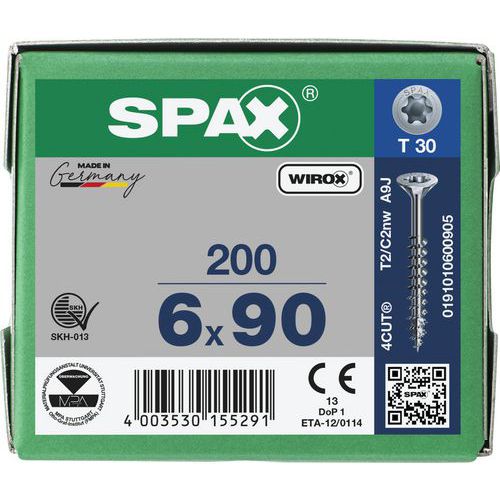 SPAX univerzális csavarok teljes menettel - süllyesztett fejjel, önmetsző hegyű. A kiváló minőségű, teljes menetű SPAX univerzális csavarok gyors, hatékony és tiszta munkához készültek fában, előfúrás nélkül. A fej és a hegy speciális kialakításának köszönhetően ideálisak faépítészethez, bútorszereléshez vagy belsőépítészethez. A sokszögű alsó résszel rendelkező süllyesztett fej meghúzáskor magától belevág az anyagba, így nincs szükség előfúrásra. A négyzet alakú profilú önmetsző hegy kinyomja a fa rostjait, pontos helyet biztosítva a csavartestnek. A teljes hosszban végigfutó menet szilárd és egyenletes csatlakozást biztosít. Korróziógátló kezelés a hosszabb élettartam és a nedves környezetben való használat érdekében.