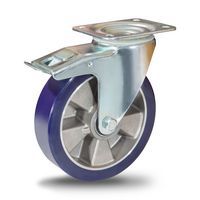 Alumínium szerkezetű görgő poliuretán köpennyel. A dupla golyóscsapágy nagy ütésállóságot biztosít. Csavarral rögzíthető a talp rögzítő furatai segítségével.