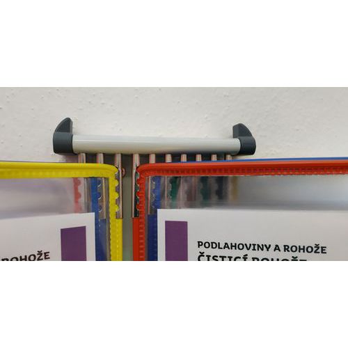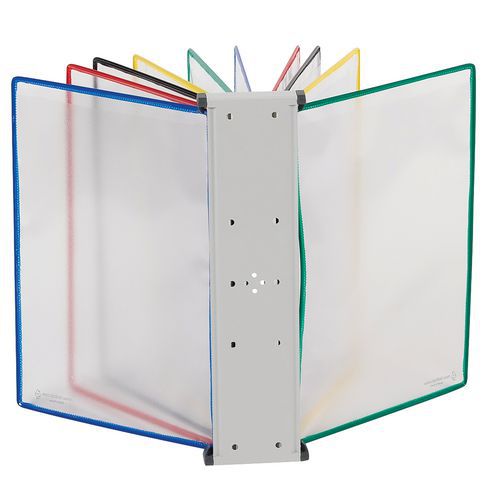 Fali tartók áttetsző információs táblákkal. Alkalmas olyan helyeken történő használatra, ahol több dokumentumot kell kis helyen láthatóvá tenni. A tartó RAL 7035 színű lakkozott fémből, a zsebek polivinil-kloridból készülnek fekete, piros, sárga, zöld és kék színben.