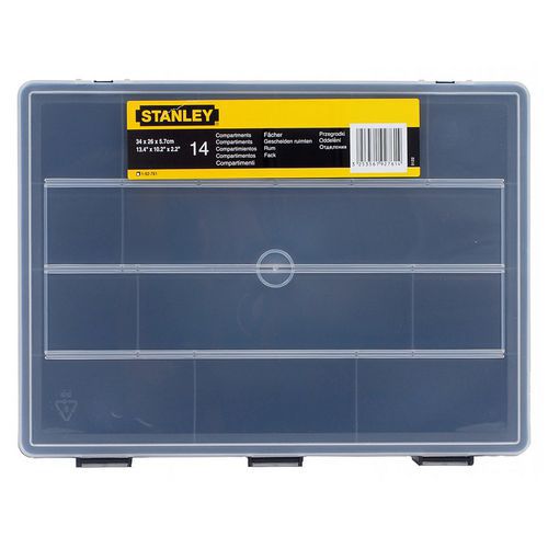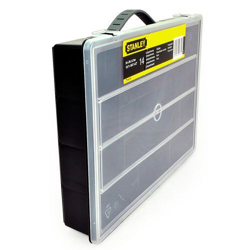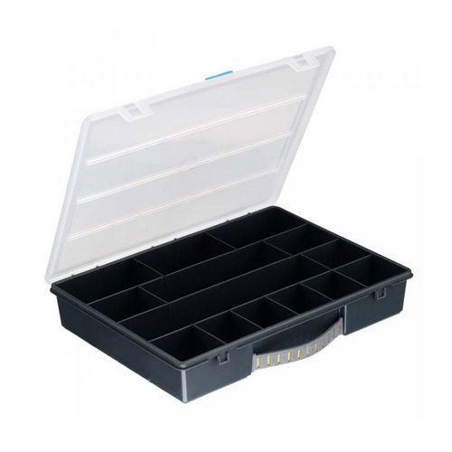 - A műanyag tároló tizennégy, nem állítható rekeszt tartalmaz az apróbb anyagok tárolására. Átlátszó fedél, műanyag kapcsok segítségével zárható. Könnyű mozgatás a fogantyú segítségével.