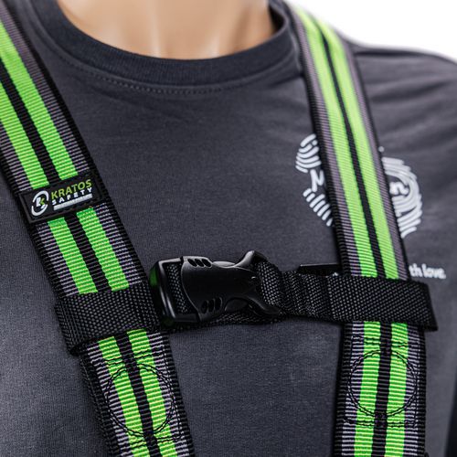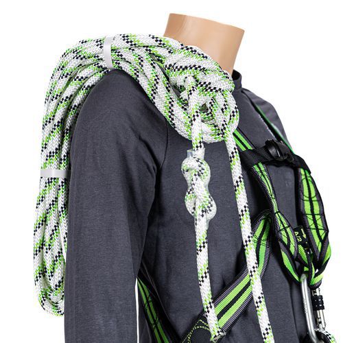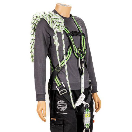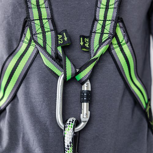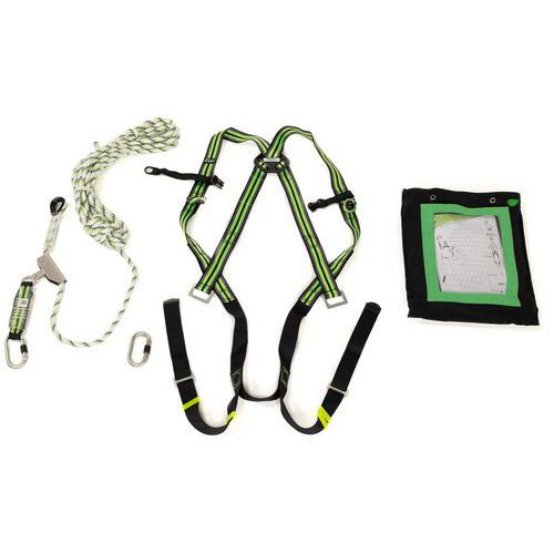 A készlet tartalma: 1 zuhanásgátló heveder 2 rögzítési ponttal, 1 x 1 m irányított zuhanásgátló energiaelnyelővel, 1 db acél csavaros karabiner 18 mm-es furattal, 1 juta zacskó.