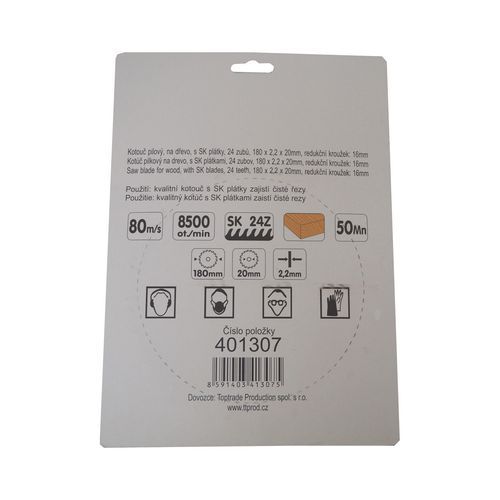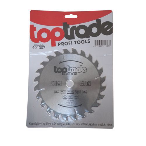 | Termék neve | TOPTRADE fűrésztárcsa, fához, szinterezett karbid élekkel, 24 fog, 180 x 2,2 x 20/16 mm |