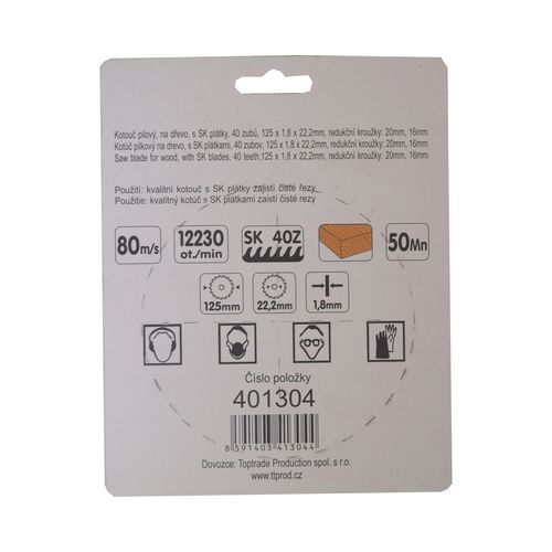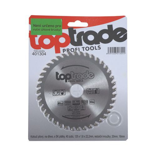 | Termék neve | TOPTRADE fűrésztárcsa, fához, szinterezett karbid élekkel, 40 fog, 125 x 1,8 x 22,2/20/16 mm |