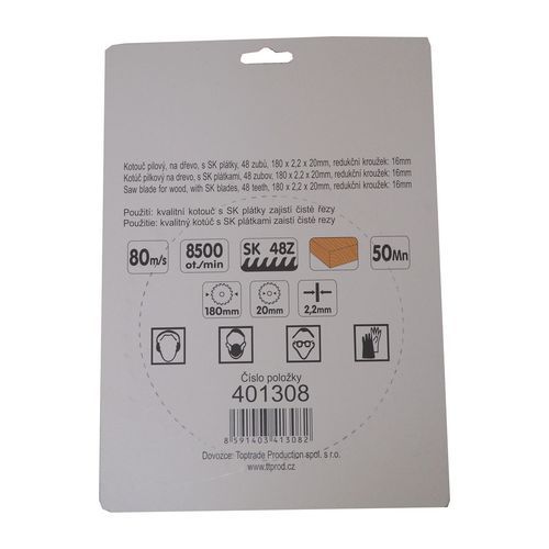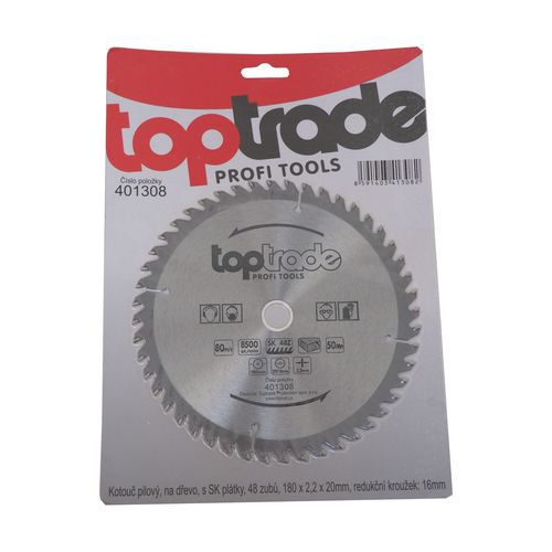 | Termék neve | TOPTRADE fűrésztárcsa, fához, szinterezett karbid élekkel, 48 fog, 180 x 2,2 x 20/16 mm |