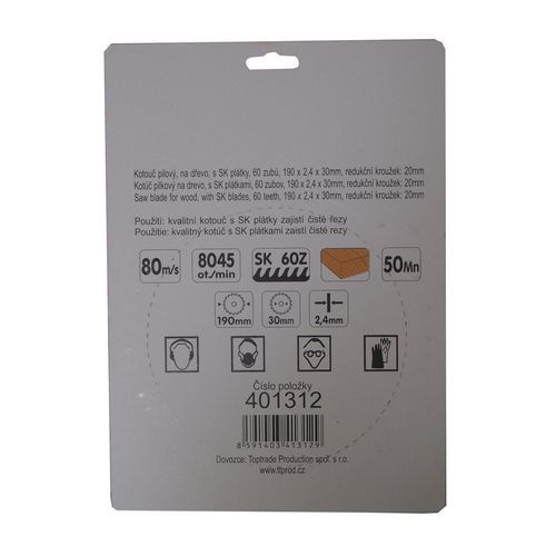 | Termék neve | TOPTRADE fűrésztárcsa, fához, szinterezett karbid élekkel, 60 fog, 190 x 2,4 x 30/20 mm |