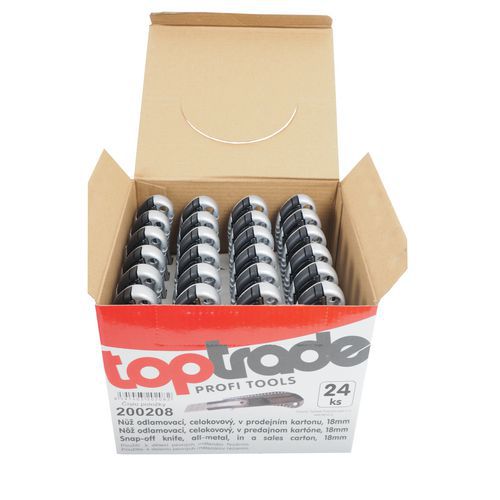 TOPTRADE vágókés tördelhető pengével, teljesen fém, értékesítői kartonban, 18 mm, 24 db-os kiszerelés