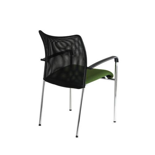 Trinity modern konferenciaszék légáteresztő hálós háttámlával és kárpitozott ülőlappal. Használható irodahelyiségekben, hivatalokban, iskolai folyosón, dolgozószobában vagy bármilyen váróteremben. Krómozott kivitelű stabil hegesztett talppal. Fekete műanyag karfák a fokozott kényelem érdekében. Ötösével rakásolva könnyedén hordozható és tárolható.