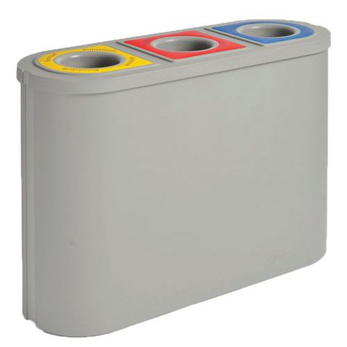 Válogatóállomás 3 hulladékáramhoz: papír, műanyag és egyéb hulladék (4 nyelven). 100%-ban újrahasznosított műanyagból (HDPE) készült, kiváló minőségű, garantáltan hosszú élettartamú, tartós megoldás. 3 különálló vízzáró műanyag béléssel (3 x 45 liter), amelyek a fedél felnyitásával könnyen kiüríthetők. A fedél a speciális zsanérnak köszönhetően bármely kívánt pozícióban nyitva marad. Az állomás könnyen mozgatható, és vékony, helytakarékos kialakításának köszönhetően jó megoldást kínál irodák, iskolák és nyilvános terek számára.