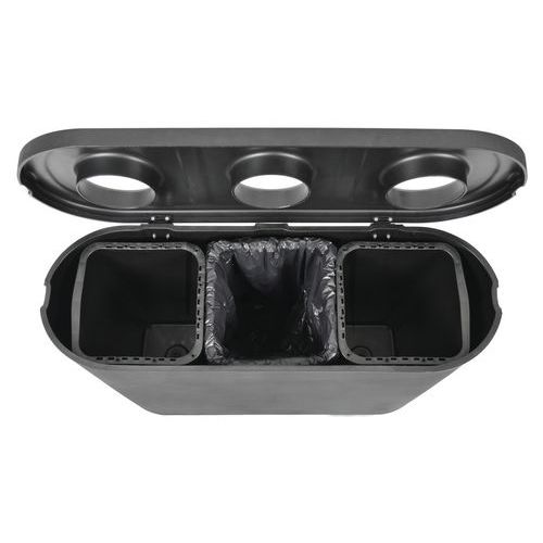 Válogatóállomás 3 hulladékáramhoz: papír, műanyag és egyéb hulladék (4 nyelven). 100%-ban újrahasznosított műanyagból (HDPE) készült, kiváló minőségű, garantáltan hosszú élettartamú, tartós megoldás. 3 különálló vízzáró műanyag béléssel (3 x 45 liter), amelyek a fedél felnyitásával könnyen kiüríthetők. A fedél a speciális zsanérnak köszönhetően bármely kívánt pozícióban nyitva marad. Az állomás könnyen mozgatható, és vékony, helytakarékos kialakításának köszönhetően jó megoldást kínál irodák, iskolák és nyilvános terek számára.