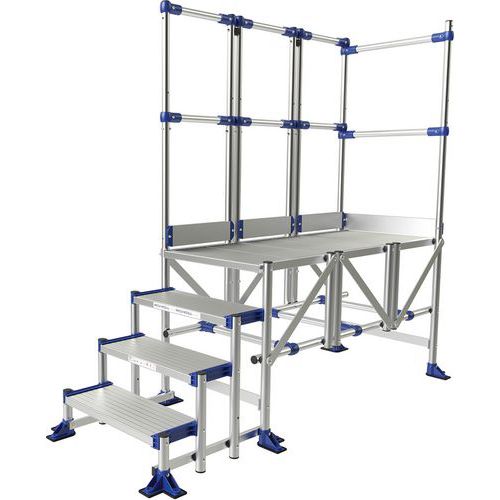 Moduláris alumínium munkaállványok 2 korláttal: 1 elülsővel + 1 oldalsóval. Stabil széles dobogó, mély, csúszásmentes lépcsőfokokkal. Dobogó szélessége: 596 mm. A dobogó szükség esetén nagy, dupla rögzítőtalpával a padlóhoz rögzíthető. Rendkívül strapabíró szerkezet, intenzív használatra alkalmas, kizárólag sík padlón használható. Kényelmes, méretezhető, sokoldalú, bármilyen igényhez hozzáigazítható. Dupla rögzítőtalp, Ø 8 mm-es csavarok (nem tartozék).