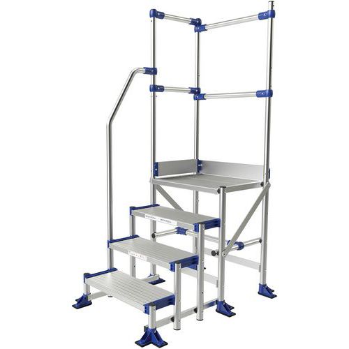 Moduláris alumínium munkaállványok 2 korláttal: 1 elülsővel + 1 oldalsóval. Egy fellépő kapaszkodóval. Fellépési és magassági biztosítás jól körbekerített kivitelű dobogóval. Stabil széles dobogóval és mély, csúszásmentes lépcsőfokokkal. Dobogó szélessége: 596 mm. A dobogó szükség esetén nagy, dupla rögzítőtalpával a padlóhoz rögzíthető. Nagyon strapabíró szerkezet, intenzív használatra alkalmas, kizárólag sík padlón használható. Kényelmes, méretezhető, sokoldalú, bármilyen igényhez hozzáigazítható. Dupla rögzítőtalp, Ø 8 mm-es csavarok (nem tartozék).