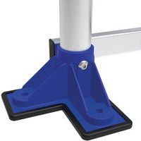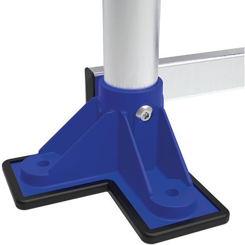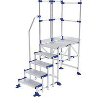 Moduláris alumínium munkaállványok 2 korláttal: 1 elülsővel + 1 oldalsóval. Egy fellépő kapaszkodóval. Fellépési és magassági biztosítás jól körbekerített kivitelű dobogóval. Stabil széles dobogóval és mély, csúszásmentes lépcsőfokokkal. Dobogó szélessége: 596 mm. A dobogó szükség esetén nagy, dupla rögzítőtalpával a padlóhoz rögzíthető. Nagyon strapabíró szerkezet, intenzív használatra alkalmas, kizárólag sík padlón használható. Kényelmes, méretezhető, sokoldalú, bármilyen igényhez hozzáigazítható. Dupla rögzítőtalp, Ø 8 mm-es csavarok (nem tartozék).