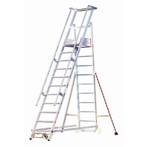 Alumínium munkaállványok polcrakodáshoz és komissiózáshoz műhelyekben. A nagyobb biztonság érdekében állítható kitámasztókkal, fellépő kapaszkodókkal és masszív korlátokkal. 3 kereke, melyek közül az egyik irányítható, jó kezelhetőséget biztosít. 600 x 480 mm méretű padló 3 oldalról 150 mm magas lábdeszkákkal. Extra széles, csúszásmentes, 100 mm-es lépcsőfokokkal. Foktávolság: 217 mm.