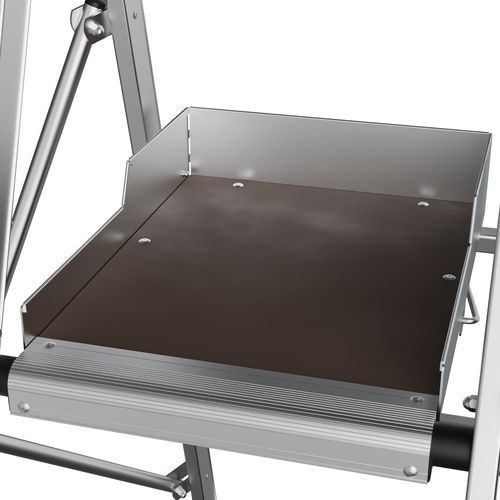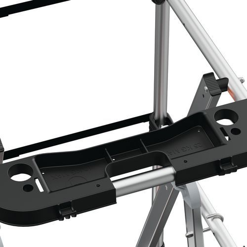 A Raptor munkaállványok a legkönnyebbek a piacon. Leesés elleni védelem 3 oldalról masszív korláttal, hátul hevederrel. Csúszásgátló bordázott 80 mm-es fokokkal. Levehető, 25 kg teherbírású rekeszes szerszámtartóval és max. 10 kg teherbírású beépített kampókkal. 500 x 400 mm-es csúszásgátló padló környezetbarát fából, beépített lábdeszkákkal (magasság: 100 mm). Ergonomikus munkaterület. Kihúzható, milliméterenként állítható kitámasztókkal.