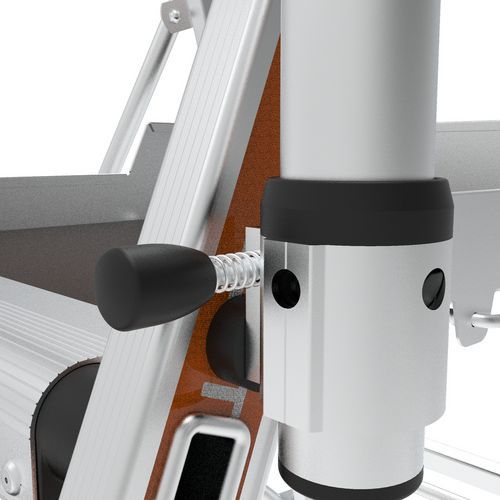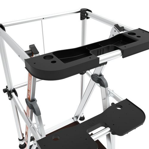 Raptor duplapolcos munkaállványok. Leesés elleni védelem 4 oldalról masszív, félautomatikusan záródó védőkorláttal. Csúszásgátló 80 mm-es fokokkal. Levehető, 25 kg teherbírású rekeszes szerszámtartóval és max. 10 kg teherbírású beépített kampókkal. 500 x 400 mm-es csúszásgátló padló környezetbarát fából. Ergonomikus munkaterület. Kihúzható, milliméterenként állítható kitámasztókkal. Max. terhelés (kg) : 150