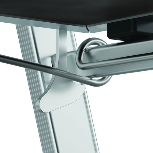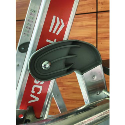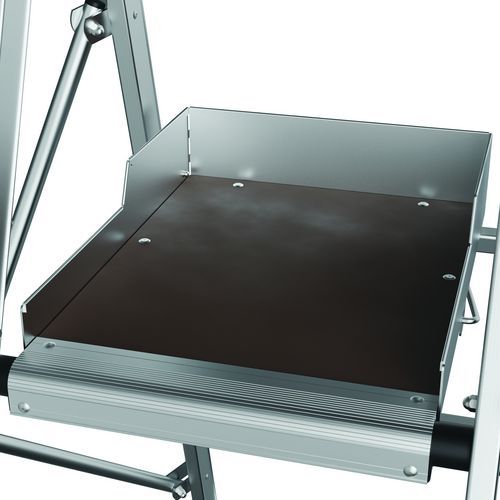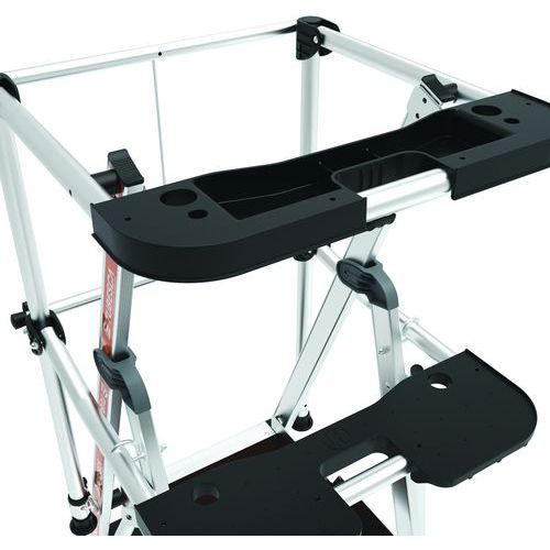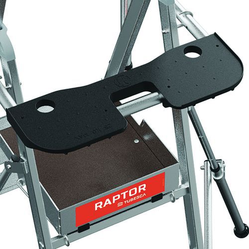 Raptor duplapolcos munkaállványok. Leesés elleni védelem 4 oldalról masszív, félautomatikusan záródó védőkorláttal. Csúszásgátló 80 mm-es fokokkal. Levehető, 25 kg teherbírású rekeszes szerszámtartóval és max. 10 kg teherbírású beépített kampókkal. 500 x 400 mm-es csúszásgátló padló környezetbarát fából. Ergonomikus munkaterület. Kihúzható, milliméterenként állítható kitámasztókkal.