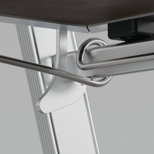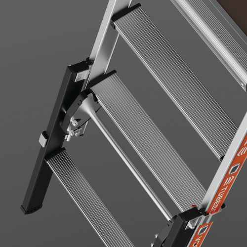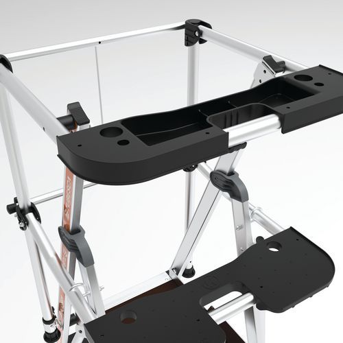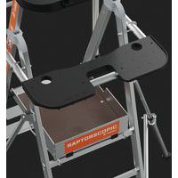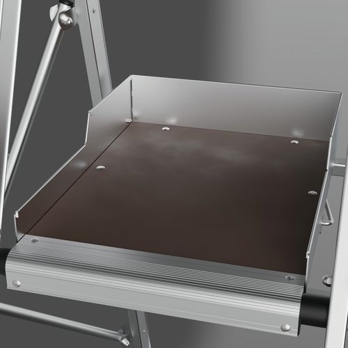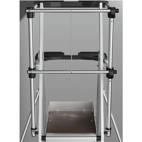 Raptorscopic kétpolcos, állítható alumínium dobogók. Leesés elleni védelem 4 oldalról szilárd, félautomatikusan záródó védőkorláttal. A csúszásgátló fokok mélysége 80 mm (szilárd szint) illetve 60 mm (teleszkópos szint). Levehető, 25 kg teherbírású rekeszes szerszámtartóval és 10 kg teherbírású beépített kampókkal. A teleszkópos szint lehetővé teszi a szinteltolást. Intuitív és biztonságos rendszerű 23 centiméterenkénti magasságállítással. 500 x 400 mm-es csúszásgátló padló környezetbarát fából. Ergonomikus munkaterület. Kihúzható, milliméterenként állítható kitámasztókkal.