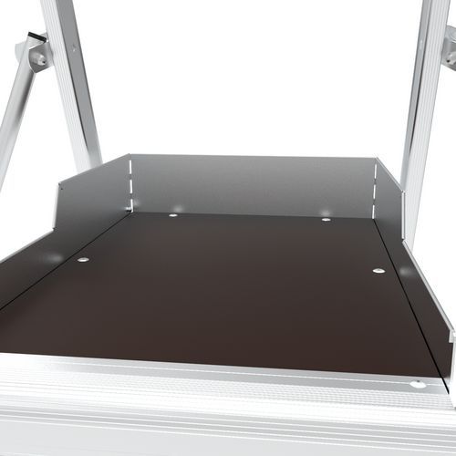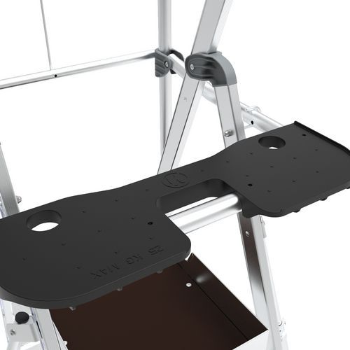 Raptor duplapolcos munkaállványok. Leesés elleni védelem 4 oldalról masszív, hátoldalon félautomatikusan záródó védőkorláttal. Csúszásgátló 80 mm-es fokokkal. Levehető, 25 kg teherbírású rekeszes szerszámtartóval és max. 10 kg teherbírású beépített kampókkal. Kihúzható, milliméterenként állítható kitámasztókkal. Rendkívül kényelmes, 590 x 400 mm-es csúszásgátló padlóval. Ergonomikus és kényelmes munkaterület. Ø175 mm terepkerekekkel. Max. terhelés (kg) : 150