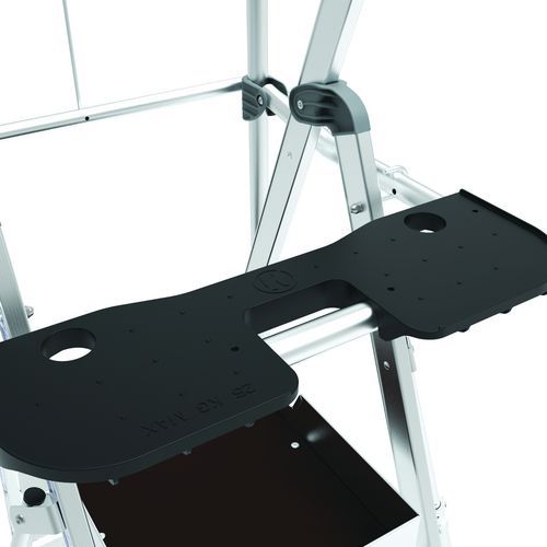 Raptor duplapolcos munkaállványok. Leesés elleni védelem 4 oldalról masszív, hátoldalon félautomatikusan záródó védőkorláttal. Csúszásgátló 80 mm-es fokokkal. Levehető, 25 kg teherbírású rekeszes szerszámtartóval és max. 10 kg teherbírású beépített kampókkal. Kihúzható, milliméterenként állítható kitámasztókkal. Rendkívül kényelmes, 590 x 400 mm-es csúszásgátló padlóval. Ergonomikus és kényelmes munkaterület. Ø175 mm terepkerekekkel. Max. terhelés (kg) : 150 kg