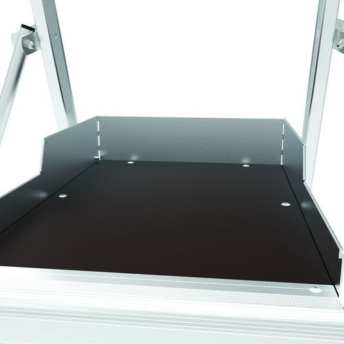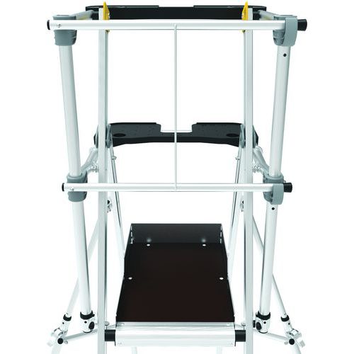 Raptor duplapolcos munkaállványok. Leesés elleni védelem 4 oldalról masszív, hátoldalon félautomatikusan záródó védőkorláttal. Csúszásgátló 80 mm-es fokokkal. Levehető, 25 kg teherbírású rekeszes szerszámtartóval és max. 10 kg teherbírású beépített kampókkal. Kihúzható, milliméterenként állítható kitámasztókkal. Rendkívül kényelmes, 590 x 400 mm-es csúszásgátló padlóval. Ergonomikus és kényelmes munkaterület. Ø175 mm terepkerekekkel. Max. terhelés (kg) : 150 kg