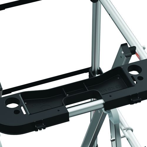 Veloce mobil munkaállványok. Leesés elleni védelem 3 oldalról masszív korláttal, hátul hevederrel. Behúzható kerekekkel az optimális mobilitásért. 80 mm-es csúszásgátló fokokkal. Levehető, 25 kg teherbírású rekeszes szerszámtartóval és max. 10 kg teherbírású beépített kampókkal. 500 x 400 mm-es csúszásgátló padló környezetbarát fából. Ergonomikus munkaterület. Kihúzható, milliméterenként állítható kitámasztókkal.