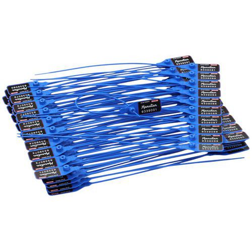 Polipropilénből készült zárható biztonsági plombák. A stabil rögzítést a fogazott fémlap biztosítja. Minden plombának egyedülálló azonosító száma van. Huzal átmérő 2,3 mm.