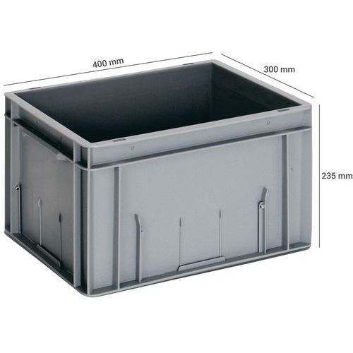 Európai szabványnak megfelelő egymásra rakható szállítótartály. Süllyesztett fogantyúkkal és két címketartóval. Szilárd alap és oldalak.
