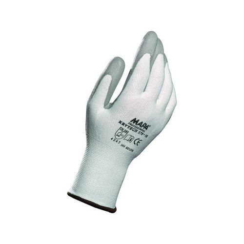 Vágásgátló kesztyű poliuretán bevonatú tenyérrel és ujjakkal. Vágásállóság 3. Kesztyű hossza: 22 - 27 cm. Felhasználási javaslat: vékony lapok összeszerelése, nyers alkatrészek vagy lapok kezelése, karton és papír kezelése. Ov Méret: 7, 8, 9, 10 Piktogramok: 1 / 4343, 9, 10 Szabványok: EN 388, EN 420 Anyagösszetétel: varrat nélküli kötött HDPE szálból Hossz: 22-27 cm