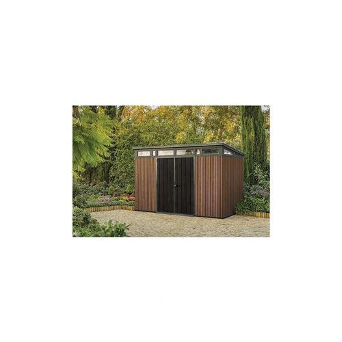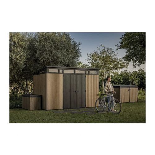 Karbantartásmentes, barna műanyag kivitelű Vertical kerti fészer a rendkívül korszerű, fahatású Decocoat anyagból. Robusztus szerkezetű dupla falakkal és fém merevítőkkel. Szerszámok, kerti kiegészítők, fűnyíró vagy grillsütő tárolására kitűnően használható. Széles, 140 x 182 cm méretű dupla ajtóval és kiemelkedően nagy, 150 kg/m2 teherbírású padlóval. Maximális tetőterhelés: 150 kg/m2, szélállóság: 145 km/h-ig (rögzített fészer esetén érvényes). Használata során előnyt jelent az ablak, a tetőablakok és a retesz.