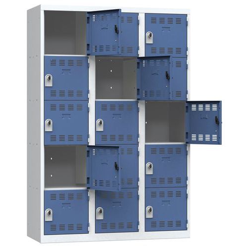 | Termék neve | Vinco hegesztett öltözőszekrény, 3 oszlopban 15 rekesszel, 400 mm, forgóretesszel, szürke/kék |