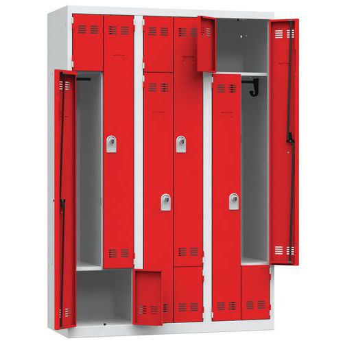 Vinco hegesztett öltözőszekrény, Z-ajtóval, 6 rekesszel, forgóretesszel, szürke/piros Vinco hegesztett öltözőszekrény, Z-ajtóval, 6 rekesszel, forgóretesszel, szürke/piros