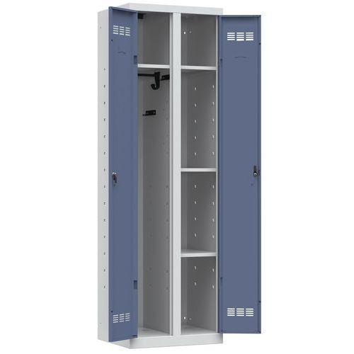 Hegesztett többcélú szekrény 0,7 mm vastagságú acéllemezből. A belső tér egyik szekciója (akasztórúddal és ruhaakasztókkal) a ruhák, a másik szekciója különálló rekeszekre osztva szerszámok, anyagok stb. tárolására szolgál. Az egyes rekeszek külön-külön forgóretesszel, lakattal zárhatók (lakat nem tartozék). A szellőzést biztosító ajtón névcímke elhelyezhető.