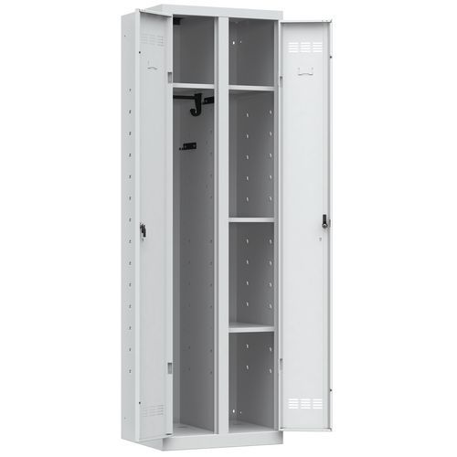 Hegesztett többcélú szekrény 0,7 mm vastagságú acéllemezből. A belső tér egyik rekesze (akasztórúddal és ruhaakasztókkal) a ruhák, a másik rekesze különálló szekciókra osztva szerszámok, anyagok stb. tárolására szolgál. Hengerzárral zárható, két kulccsal. A szellőzést biztosító ajtón névcímke elhelyezhető.