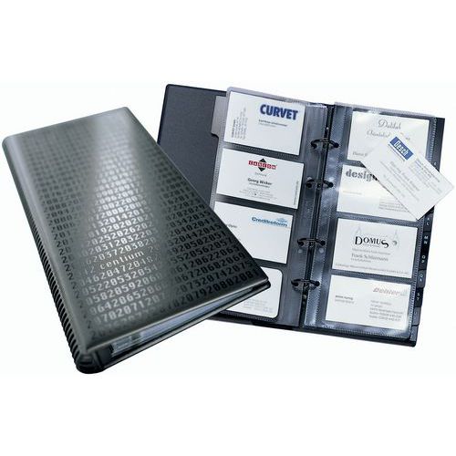 Tartós névjegykártyatartó a kemény kötésnek köszönhetően. A tartalom gyors azonosítása átlátszó zsebekkel. Címjegyzék 12 füllel, A-tól Z-ig nyomtatva a könnyű azonosítás érdekében. Gyűrűs mechanizmus a zsebek kihúzásához.