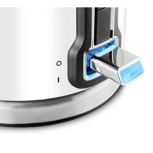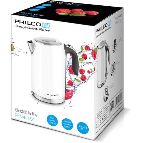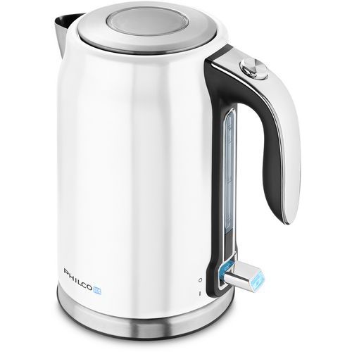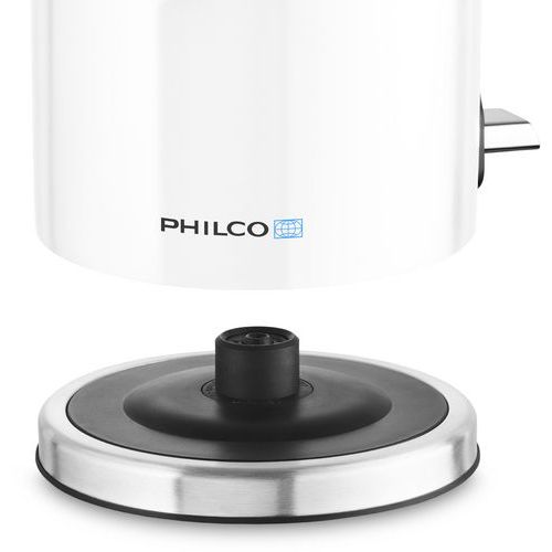 Philco vízforraló egészségre ártalmatlan rozsdamentes anyagból és ergonomikus fogantyúval. A vízforraló visszajelző fénnyel rendelkezik a kapcsolóban, átlátszó fedél, burkolt fűtőspirál és mosható szűrő a szennyeződések és az üledékek felfogására. Az alapzat középső 360°-os csatlakozóval és külső vízszint jelzővel. A tápkábel hossza 72 cm.
