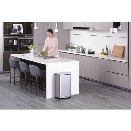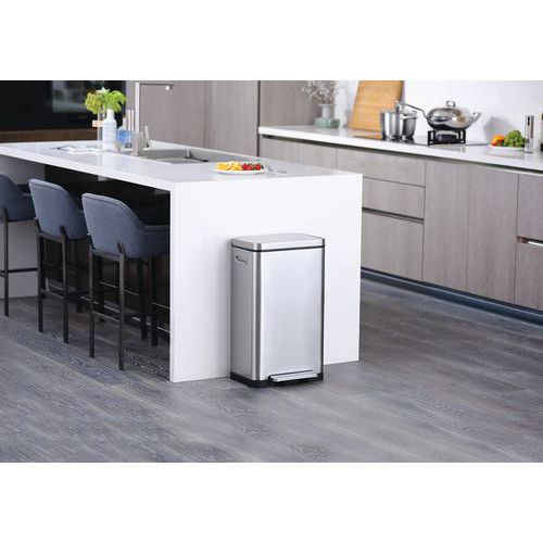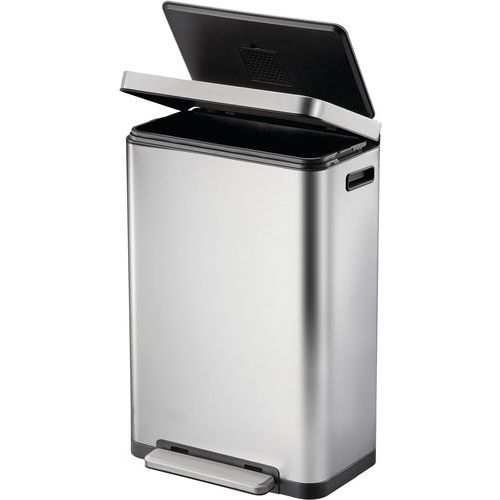 Elegáns téglalap alakú hulladékgyűjtő extra nagy lábpedállal, szintetikus béléssel, hangtalanul záródó fedéllel és nyitva maradó funkcióval. Ez a csiszolt rozsdamentes acélból készült hulladékgyűjtő ujjlenyomat-mentesített és nanoezüst antibakteriális bevonattal rendelkezik. A szilikon zárógyűrű biztosítja, hogy a kellemetlen szagokat hatékonyan visszatartsa a szemetesben. A fedél beépített szagszűrővel rendelkezik. A csuklós perem nyitva tartja a kukát, így a szemeteszsák cseréje és a szemeteszsák eltávolítása egyszerű.