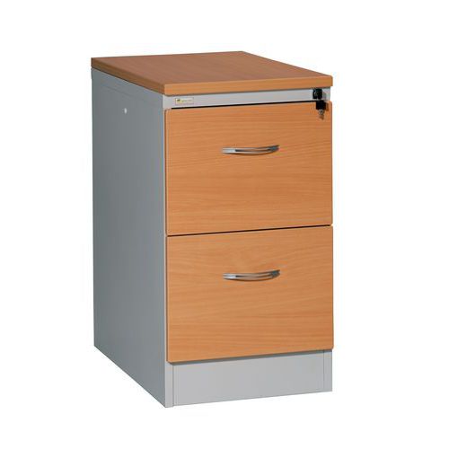 Acél szerkezetű és farostlemez elemekkel rendelkező irattartó szekrények. Központi hengerzár, perforált fiókaljak. színe: bükk, calvados, cseresznye, szürke RAL 7035 váz formátum: A4 fiókok száma: 2 fiók kihúzhatósága: 100% fiók teherbírása: 40 kg kivitel: egysoros méretek ma x szé x mé: 73,5 x 41,6 x 64 cm a fiók belső méretei ma x szé x mé: 24,5 x 32,5 x 53 cm anyaga: laminált farostlemez, acéllemez zár: központi hengerzár porlakkozásos felületkezelés, több fiók egyszerre történő kihúzás elleni blokkolás, zár két kulccsal, címketartó, készre szerelve Fém szerkezetű acél irattartók faforgács elemekkel. Központi hengerzárral, perforált fiókfenékkel.