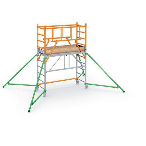 Praktikus mobil állványzat a magasban történő kényelmes és biztonságos munkavégzéshez. Az S-PLUS állvány merevített korlátokkal van ellátva a fokozott biztonság érdekében. A szerkezetet 45 mm-es alumínium profilok és kereszttartók alkotják. 60 x 180 cm méretű járólappal, oldalsó bokalécekkel ellátva. Az állványok a 2-es mérettől kezdődően stabilizáló kitámasztókkal vannak felszerelve. A könnyen kezelhető, egykezes robusztus rögzítőcsapos összecsukó mechanikával egyetlen mozdulattal rögzíthető és kioldható. Könnyen mozgatható edzett műanyagból készült csapokkal, így a keretek összeállításakor nincs elakadás. A mobilitást 125 mm átmérőjű fékezhető műanyag kerekek biztosítják. A kerékmagasság állítása a külön megvásárolható kerékadapterrel biztosítható (nem része a csomagnak). Az állványzat megfelel az EN 1004 szabvány szerinti 3-as állványosztálynak (teherbírás 200 kg/m2-ig).