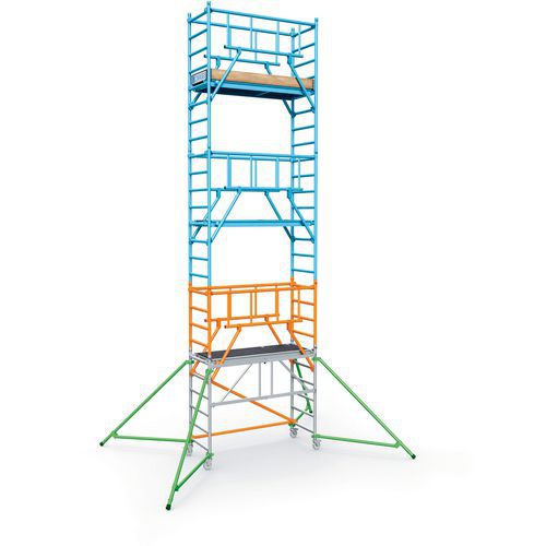 Praktikus mobil állványzat a magasban történő kényelmes és biztonságos munkavégzéshez. Az S-PLUS állvány merevített korlátokkal van ellátva a fokozott biztonság érdekében. A szerkezetet 45 mm-es alumínium profilok és kereszttartók alkotják. 60 x 180 cm méretű járólappal, oldalsó bokalécekkel ellátva. Az állványok a 2-es mérettől kezdődően stabilizáló kitámasztókkal vannak felszerelve. A könnyen kezelhető, egykezes robusztus rögzítőcsapos összecsukó mechanikával egyetlen mozdulattal rögzíthető és kioldható. Könnyen mozgatható edzett műanyagból készült csapokkal, így a keretek összeállításakor nincs elakadás. A mobilitást 125 mm átmérőjű fékezhető műanyag kerekek biztosítják. A kerékmagasság állítása a külön megvásárolható kerékadapterrel biztosítható (nem része a csomagnak). Az állványzat megfelel az EN 1004 szabvány szerinti 3-as állványosztálynak (teherbírás 200 kg/m2-ig).