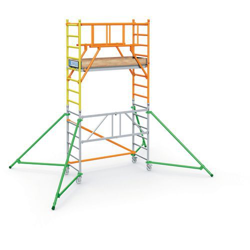 Praktikus mobil állványzat a magasban történő kényelmes és biztonságos munkavégzéshez. Az S-PLUS állvány merevített korlátokkal van ellátva a fokozott biztonság érdekében. A szerkezetet 45 mm-es alumínium profilok és kereszttartók alkotják. 60 x 180 cm méretű járólappal, oldalsó bokalécekkel ellátva. Az állványok a 2-es mérettől kezdődően stabilizáló kitámasztókkal vannak felszerelve. A könnyen kezelhető, egykezes robusztus rögzítőcsapos összecsukó mechanikával egyetlen mozdulattal rögzíthető és kioldható. Könnyen mozgatható edzett műanyagból készült csapokkal, így a keretek összeállításakor nincs elakadás. A mobilitást 125 mm átmérőjű fékezhető műanyag kerekek biztosítják. A kerékmagasság állítása a külön megvásárolható kerékadapterrel biztosítható (nem része a csomagnak). Az állványzat megfelel az EN 1004 szabvány szerinti 3-as állványosztálynak (teherbírás 200 kg/m2-ig).