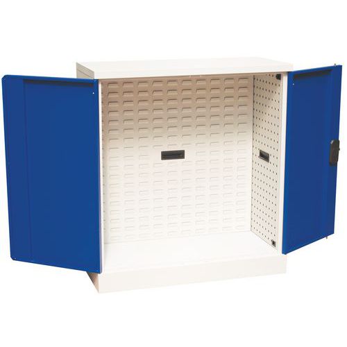 A feneke tárolóval és oldalpanelekkel van felszerelve a szerszámtartó horgokra. Dupla nyílóajtóval és zárral. Az ajtók tompítóval rendelkeznek a csendes zárásért. Könnyen összeszerelhető, különleges szerszámok nélkül. Minden Manutan terméket a csapatunk tesztelt és hagyott jóvá. Biztonsági tippek: - A szekrényt egyenes felületen állítsa fel. - Erősítse a falra vagy a válaszfalra megfelelő rögzítéssel. - Ügyeljen arra, hogy ne lépje túl az engedélyezett teherbírást, és ügyeljen a teher megfelelő eloszlására. Jótállás: 10 év.